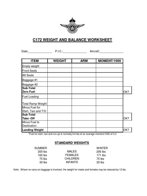 A weight and balance worksheet is an essential document for any aircraft pilot. It helps the pilot ensure that the aircraft remains within its approved weight and balance limits. The worksheet should include the aircraft’s empty weight, passengers’ and crew’s weight, fuel weight, and any baggage or cargo weight. Calculating the aircraft’s weight and balance is a critical part of flight preparation, and the aircraft’s centre of gravity must remain within the approved centre of gravity limits.